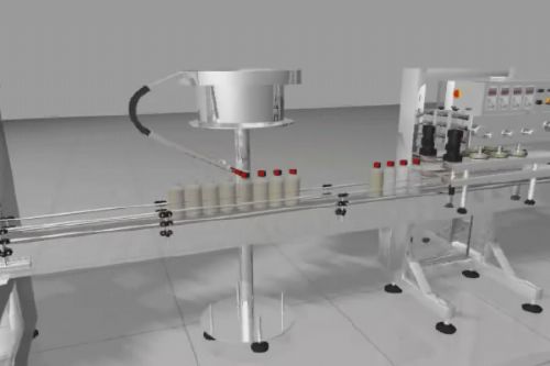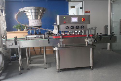 由人工将瓶盖倒入理盖机,该机可自动将瓶盖整理成统一样式输出至生产线上经过的瓶子上,再经过后面的
