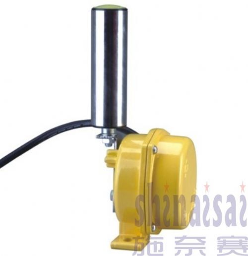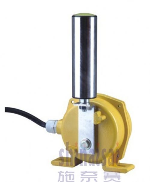 胶带发生跑偏现象时,胶带边缘带动立棍旋并挤压使之倾斜,若立棍倾斜角度大于一级动作角度时,开关发生一组开关信号,如立棍继续倾斜大于二级动作角度时则输出另一组开关信号。两组开关信号可分别用于告警或停机,胶带机复位正常运行,立棍自动复位。