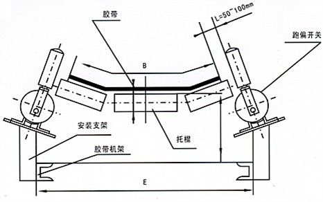 将跑偏开关固定在支架上,然后焊接在胶带机架上;立辊轴线与胶带平面相垂直,立辊与胶带边缘距离为L=50 100mm