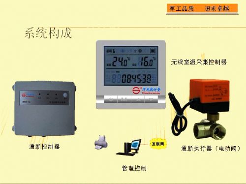控制阀,对该用户的循环水进行通断控制来实现该户的室温调节。同时在各户的代表房间里放置室温采集控制器,用于测量室内温度和用户设定温度,并将这两个温度值传输给通断控制阀。通断控制阀根据实测室温与设定值之差,确定在一个控制周期内通断阀的开停比,并按照这一开停比控制通断