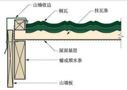 近山墙侧折弯并紧靠于山墙板。山墙收边的搭接长度为100mm。