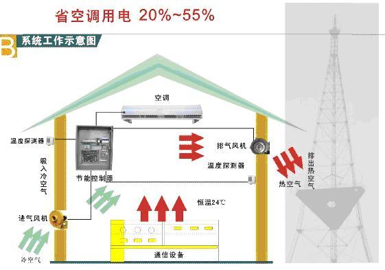由于基站内温度的升高是因电气设备的长期运行发热、而非站外环境温度所致。如一年四季均用空调来保持站内温度(主要是降温),则冬、春、秋三季及夏季的早晚时段的室外低温便可散热降温的有利条件被忽视,从而导致电能的浪费、营运成本居高不下。基站换气节能系统充分利用基站室内外的温差而形成热交换,依靠大量的空气流通,有效地将基站内的热量迅速向外迁移,实现室内散热。从而大幅度降低电能消耗和营运成本、延长空调使用寿命。