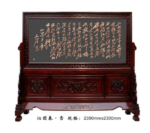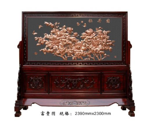 花梨木经手工雕刻后为框架,以紫铜精细电铸雕刻后为画面,两者特别协调,相得益彰,更显艺术气息,文雅风采。规格从1米至7米不等,价格为一万至四十几万。
