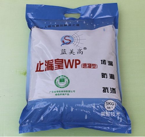 藍美高止漏皇是以多種化工原料,經過科學有序的加工精制而成的一種快凝快硬,早期強度高,具有微膨脹的特種水泥。