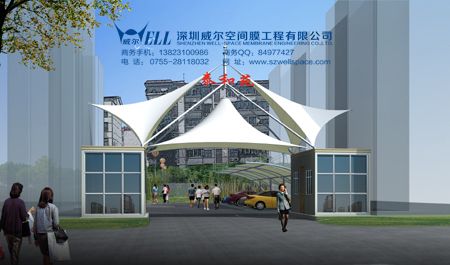 六、景观设施:建筑入口膜结构、标志性小品膜结构、步行街膜结构、房产公司张拉膜结构、小区花园张拉膜结构等。