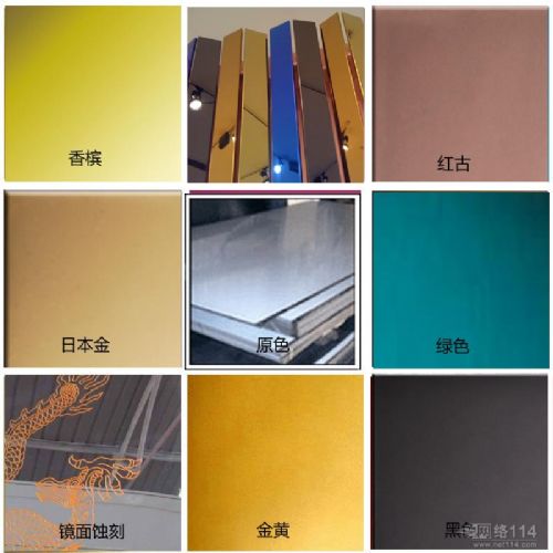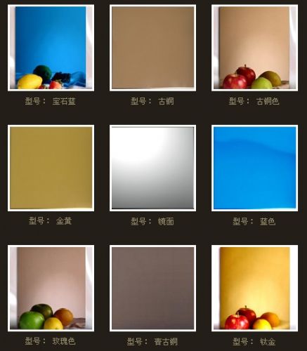 钢板,表面无任何涂料、无任何毒性。它是在银白色的不锈钢表面形成一层透明的氧化膜,通过该氧化膜对光的干涉作用而形成不同的色彩。不同厚度的氧化膜可以产生不同的色彩。同样厚度的氧化膜,随着光线入射角度不同,即使同种光也会显示不同的颜色。当天气变化(空气湿度变化)时,表面氧化膜也会变化,颜色也随之改变,因此,其色彩是神幻无比。但是,每一厚度的氧化膜都对应着一种基本颜色,当表面膜上的湿气消去,氧化膜即复原,颜色也恢复到原来的本色。通常的色彩系列有:茶色、黑色、深茶红色、紫蓝色、藏青色、宝石蓝色、蓝色、灰色、淡黄色、金黄色、金红色、紫红色、天蓝色、绿色、黄绿色等。