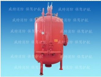 压力水经水管路进入罐体内,产生压力挤压胶囊使泡沫液经出液管被挤出,使泡沫液与比例