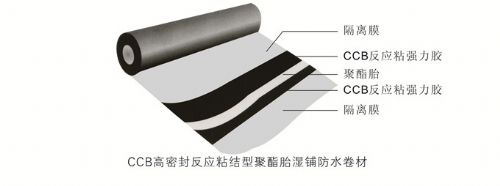 强力胶、聚酯胎和隔离膜组成。通过浸渍、冷却、覆膜等工艺加工而成。卷材两面的CCB反应粘强力胶能与水泥凝胶反应,实现卷材与混凝土不可逆的微观满粘,达到真正的高密封体系,杜绝窜水。