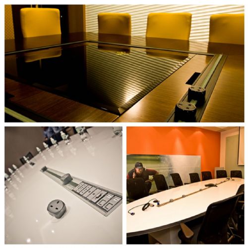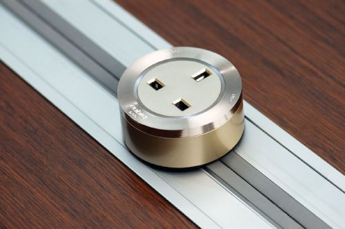 会议桌插座(第二张图)外观设计新颖,高贵大方。使用灵活可任意增加、移除、重新定位电力输出口。电力轨道的多媒体连接器:电话、网络、视频、音频、HDMI、USB等各类接口一应俱全。