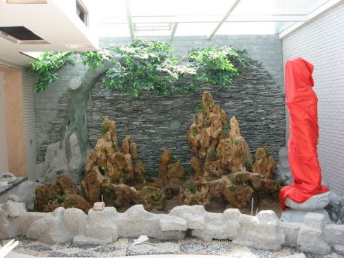 假山布置在住宅附近,作为艺术作品,比真山更为概括、更为精炼,可寓以人的思想感情,使之有“片山有致,寸石生情”的魅力。人为的假山又必须力求不露人工的痕迹,令人真假难辨。与中国传统的山水画一脉相承的假山,贵在似真非真,虽假犹真,耐人寻味。
