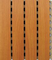 密度板的正面开槽、背面穿孔的狭缝共振吸声材料;通常用于墙面装饰和吸声降噪。
