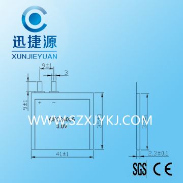 CP224035 尺寸:2.2*40*35MM 电压:3.0V 容量:600毫安 内阻:R<=5欧姆 *大连续放电电流:60mA *大脉冲电流:100mA 自放电:2%年 工作温度-20+85重量7g 7.安全可靠性