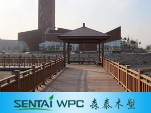 森泰塑木材料:是一种新型的复合材料,由天然的木粉或竹粉加上高密度聚乙烯加工而成。这种材料结实,防水,在各种天气和气候条件下表现良好、耐风暴、腐烂、咸水、沙地侵蚀。该木塑材料是在专门的机器里经高温高压挤出成型,所以每一块材料都是没有结巴,尺寸。颜色、长短一致。如此可以不用施工时挑选材料而花费时间和人力。这种材料看起来,闻起来,和手感都像木材,但是却有着塑料的耐用