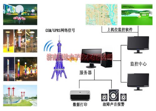 灯光控制器和远程灯光控制管理软件组成,基于CDMA/GPRS无线公共网络进行远程传输控制,城市路灯和景观灯的开/关控制均可实现远程或者自动控制。