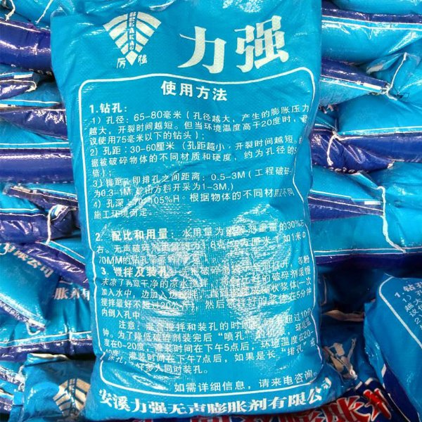 无声破碎剂又称可控性切割和破碎的膨胀剂、静态破碎剂、静裂剂、胀裂剂、裂石剂等。它是一种由多种无机物制作而成的具有高膨胀性能的非爆破性破碎用的灰色粉状材料。