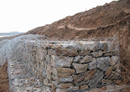 垒砌一道石笼网的堤坝,用于抵挡洪水保护道路;在路基的侧面,用石笼网箱垒砌的加固路基的石笼网。
