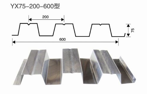 其波高为75mm,波矩为200mm,有效宽度600mm,进料宽度为普通的1000mm的,根据不同厚度其截面惯性矩值在60.38-128.19(cm*4/m)截面抵抗矩值在16.42—35.37cm*3/m,yx75-200-600