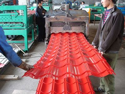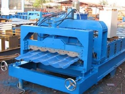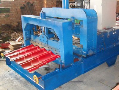 液压缸带动模具上下移动,可以把彩钢压成许多节,形似琉璃瓦。切刀部分是液压缸带动刀具上下移动,可以把彩色钢瓦切断。