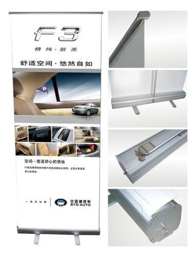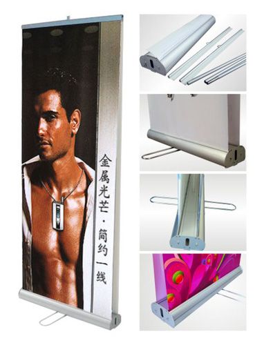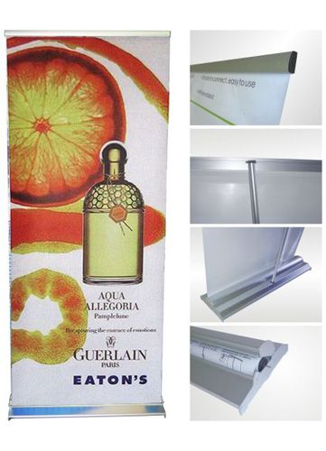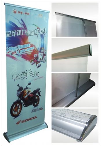 构造是一个座地的卷轴,由地面向上是一支申缩柱,柱顶有一个扣,使用时由卷轴拉出一幅直立式的海报,吸引途人的注意。