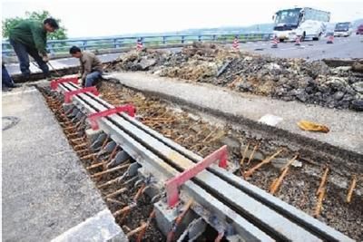 钢板,以减少拍击和噪声,该伸缩缝的构造相对复杂。弹性体伸缩装置分为锌铁皮伸缩缝和TST碎石弹性伸缩缝,弹性体伸缩装置是一种简易的伸缩缝装置,对于中小跨径的桥梁,当伸缩量在20mm-40mm以内时可以采用TST碎石弹性伸缩缝装置,是将特制的弹塑性材料TST加热熔化后,灌入经过清洗加热的碎石中,即形成了TST碎石弹性伸缩缝,碎石用以支持车辆荷载,TST弹塑性体在一25℃~60℃条件下能够满足伸缩量的要求。