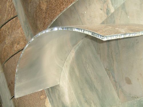 幕墙铝蜂窝板是根据现场设计的尺寸,在工厂加工。板材四周弯折,然后复合成型,再冲挂耳,挂耳与板块连成一整体,使成型后的蜂窝挂板更加牢固。蜂窝板可做成平板、弧型板、L型和U型板,全工厂化生产,质量可靠、安装方便、快捷。