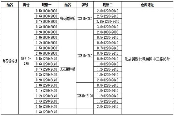 有花镀锌板 DX51D-Z80 1.0*1220*2440 无花镀锌板 DX51D-Z120 0.8*1220*2440 乐从钢铁世界A8区中三路05号