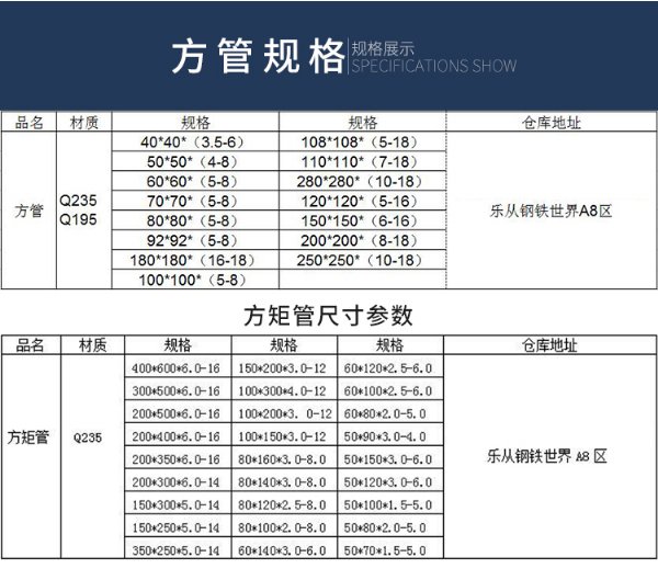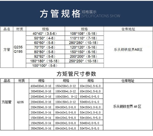 方矩管 Q235 200*500*6.0-16 100*200*3. 0-12 60*80*2.0-5. 0 乐从钢铁世界A8区中三路05号
