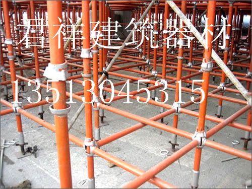 ,参照住房和城乡建设部颁发的JGJ231-2010标准生产,主要构件为立杆和横杆,盘扣节点结构合理,立杆轴向传力,使脚手架整体在三维空间结构强度高、整体稳定性好,并具有可靠的自锁功能,能有效提高脚手架的整体稳定强度和安全度,能更好的满足施工安全的需要。具有拼拆迅速、省力,结构简单、稳定可靠,通用性强,承载力大,安全高效,不易丢失,便于管理,易于运输等特点。