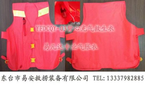 背心样式,前襟和下摆均为可调式插口,可松可紧。气胀前穿着轻便;气胀后气囊将上身紧紧裹住,合理的气室分布可将人体自动翻转仰面倾斜浮于水面,头部高于水面120毫米。