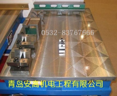 用于铆焊工艺的基础平板平台,工作面上有孔和T型槽,孔主要用来清理铆焊时的一些铁渣和焊接废弃物,T型槽主要是用来固定焊接件。