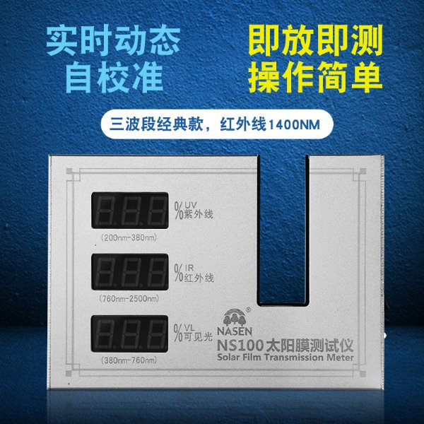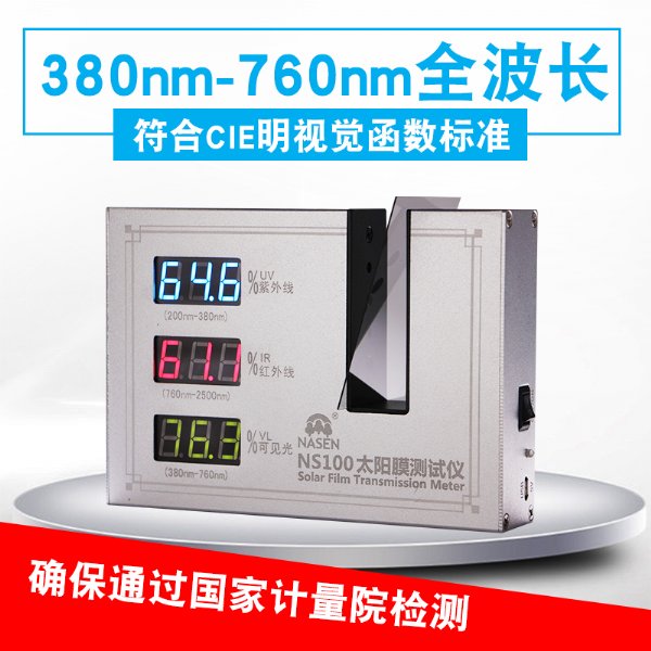 NS100的测试原理是采用紫外光源,可见光源和红外光源照射被测透明物质,感应器分别探测三种光源的入射光强和透过被测透明物质后的光强,透过光强与入射光强的比值即为透过率,用百分数表示。大多数的太阳膜,可见光标注透过率指标,红外线和紫外线标注阻隔率指标,阻隔率=100%-透过率。