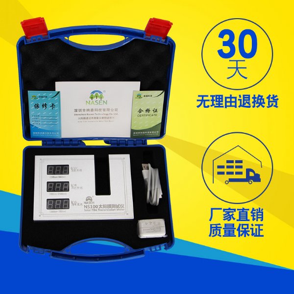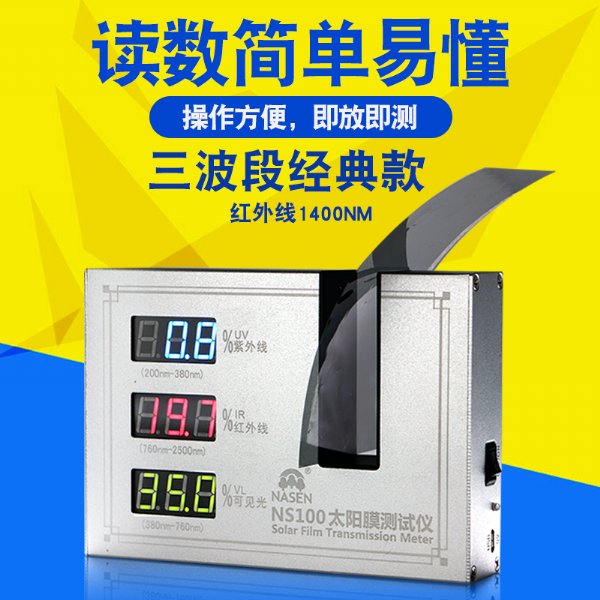 防爆膜测试仪器,主要用于汽车太阳膜的光学性能检测。可同时测试透光率,紫外线和红外线的阻隔率,数字显示,方便读数和理解。仪器采用平行光路设计,测试贴膜玻璃数据同样精准。纳森品牌防爆膜测试仪均提供质保一年,终身维护,一个月退换货的服务。