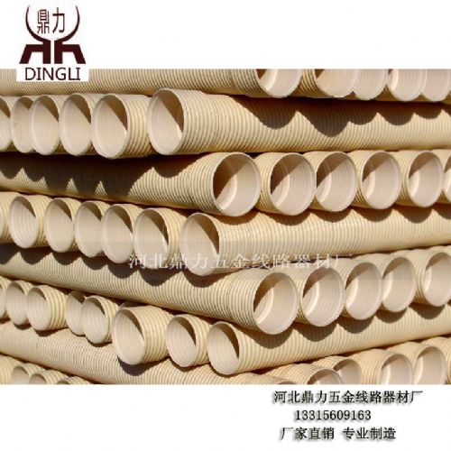 管材,内壁光滑平整,外壁呈梯形波纹状,内外壁间有夹壁中空层,其独特的管壁结构设计使此类管材具有环刚度大、质量轻、耐高压、韧性好、耐腐蚀、耐磨性好、施工方便、安装成本低、使用寿命长等特点,广泛应用于市政改造工程、建筑、工农业排水、农业节水灌溉、污水处理工程等领域。是传统