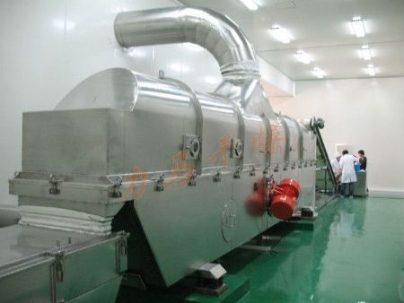 物料自进料口进入机内,在振动力作用下,物料沿水平方向抛掷向前连续运动。热风向上穿过流化床和湿物料换热,湿空气经旋风分离器除尘后由排风口排出,干燥物料由排料口排出。