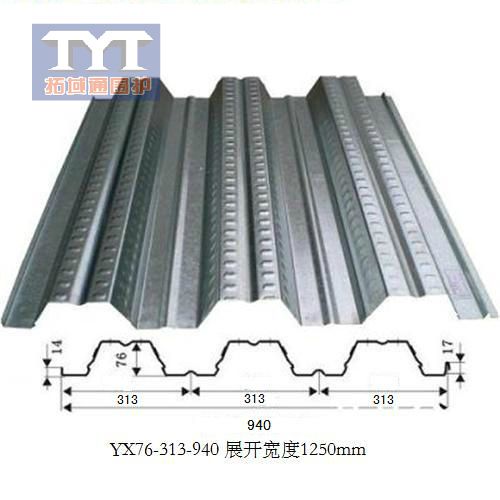 楼承板中是比较大的了)进料宽度是1250mm,再来看看yx76-313-940楼承板的截面矩;厚度0.8mm,截面惯性矩91.62cm*4/m,截面抵抗矩23.46cm*3/m;1.0mm的截面惯性矩119.38cm*4/m,截面抵抗矩30.61cm*3/m。1.2mm的截面惯性矩142.01cm*4/m,截面抵抗矩38.98cm*3/m。再来看看yx76-313-940楼承板的价格:厚度0.8mm,Q235的目前市场价格大概在49/m*2,;1.0mm的价格大概在59/m*2;1.2mm的价格在68.7/m*2。