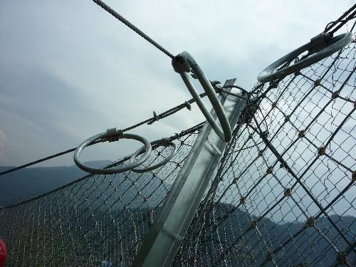 采用3Mm、抗拉强度不低于1770Mpa的高强度钢丝盘结数圈成环,并相互套接而成,其环孔直径一般为300、350、400。盘结圈数根据拦石网型号的不同而定,成品规格一般为5*3/4/5/6/7m。环形网单个环由单根钢丝盘结而成,两端头搭接长度在100mm以上,盘结而成的环用钢质或铝合金