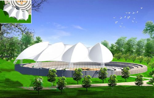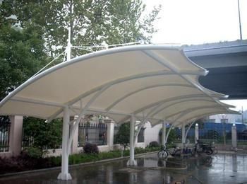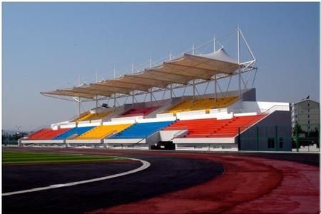 聚四氟乙烯。常用膜材为聚酯纤维覆聚氯乙烯(PVC)和玻璃纤维覆聚聚四氟乙烯(Teflon)。PVC材料的主要特点是强度低、弹性大、易老化、徐变大、自洁性差,但价格便宜,容易加工制作,色彩丰富,抗折叠性能好。为改善其性能,可在其表面涂一层聚四氟乙烯涂层,提高其抗老化和自洁能力,其寿命可达到15年左右。Teflon材料强度高、弹性模量大、自洁、耐久耐火等性能好,但它价格较贵,不易折叠,对裁剪制作精度要求较高,寿命一般在30年以上,适用于**建建筑。