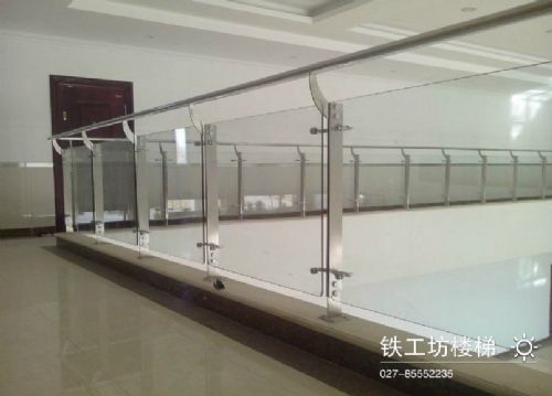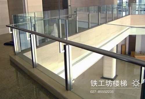 钢板主立柱,63不锈钢304圆管,12钢化玻璃组成。坚固通透美观,适合各公共场合楼梯中空护栏。