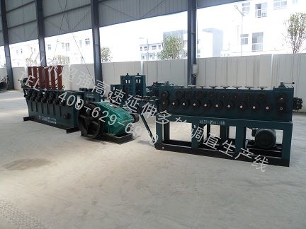 多轮延伸机→冷轧机→主机拉盘→调直机→切断机→落料架 低速,50米/分,配置普通15轮延伸机,18.5KW电机+冷轧机+11KW电机的调直机,可以将6、8、10的普线加工成三面带肋钢筋