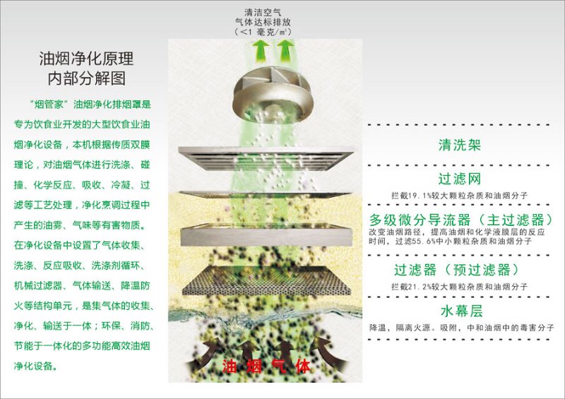 采用先进双模传质的液沫化学反应原理,将餐饮油烟净化一空,降到无色、无味、无噪音的三无很好效果,不需安装外墙油烟