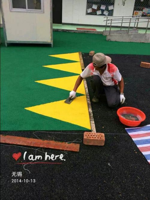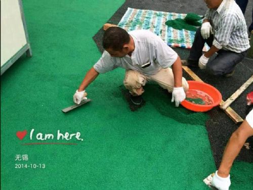 粘合剂(防水)按一定的控制比例混合特殊搅拌后,经由专业施工机械(或人工铺设)控制厚度铺设。并在其表面用EPDM胶粒与聚氨酯面漆混合专业的