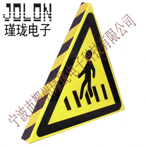 警告标志的颜色为黄底、黑边、黑图案,形状为等边三角形,顶角朝上。因为它的功能多,所以图案也非常多,如注意行人、注意信号灯、注意上坡、下坡、注意儿童、注意渡口、注意危险等等的50种。