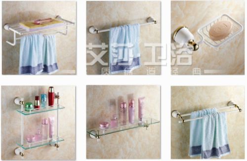 镜子、牙刷杯、肥皂台、毛巾杆、浴巾架、卷筒纸架、衣钩等,浴巾架以其玲珑的姿态已经占据了很多浴室的主力位置,尤其是对小空间的卫浴间来说,更是神来之笔。优点:空中放置,充分利用了浴室的空间,并且比放在一起来的卫生干净。尺寸:普遍从50cm—80cm左右,有特殊需要的另算。