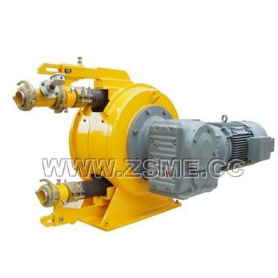 ZHP系列软管泵(挤压泵)主要有泵壳、旋转架、挤压轮、托轮、挡轮、挤压软管和驱动系统组成。挤压软管在泵壳内呈U型放置,当动力系统带动旋转架上的挤压轮转动时,软管软管被挤压轮的积压发生弹性变形,在吸入口形成负压吸入浆料,通过挤压轮的推送浆料从排出口排出,形成浆料的压力输送,依次循环工作。中尚ZHP软管泵主要应用于建筑、采矿、石油、排污、造纸、陶瓷及其它合适领域的粘稠浆料远距离输送、
