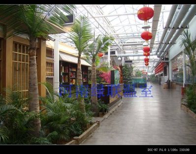 型钢结构形式,跨度大,高度高、可植入高大树木,设置亭台,造景时有更大的发挥空间,使景色更加逼真。中厅周围设置其他配套连栋温室,大部分餐饮设置于其中,降低大大的造价和后期维护费用,同时保证了充足的活动空间,美景美食交相辉映,相得益彰。