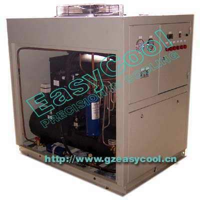 防冻液作介质;高于30℃水温的可选用不带压缩机,直接风冷式)