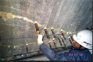 2. 预埋注胶底座:埋设时先在灌浆嘴的底盘上抹一层厚约1mm的