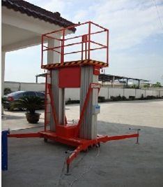 两组桅柱支撑作业平台同步升降,具有优秀的工作稳定性;整体升降式护栏装置,强度好,运输时大幅度地降低整机高度,装卸十分方便,通过一次升降即可完成装配或拆卸;可配加龙门跨架;具有单桅柱同样的方便的机动灵活性,支腿结构同单桅柱式平台;有较好的承载能力,适合于不超过两人同时登高作业。