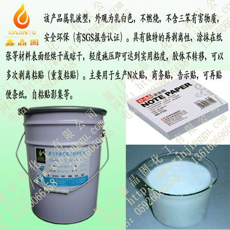 该产品属乳液型,外观为乳白色,不燃烧,不含三笨有害物质,安全环保。具有独特的再剥离性,涂抹在纸张等材料表面经烘干或晾干,轻度施压即可达到实用粘度,胶体不转移,可以多次剥离粘贴(重复粘贴)。