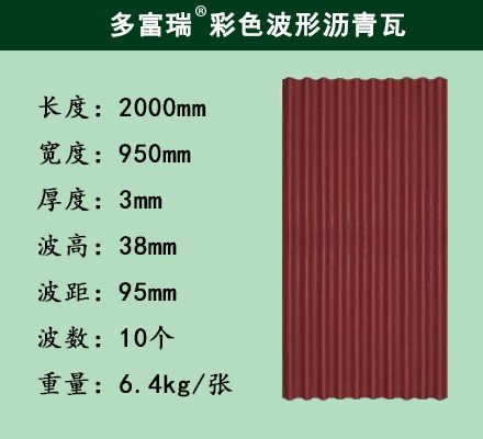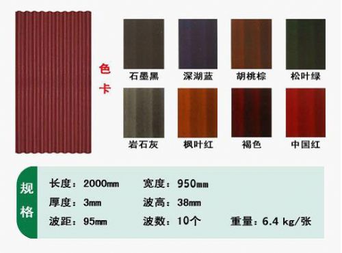 是植物纤维经制板整形后,在高温高压下浸渍沥青而成的波形屋面建筑材料。采用大波纹设计,结合现代喷涂工艺,瓦材坚实厚重,颜色持久,防水性能优异,施工方便,屋面铺设效果美观大方。